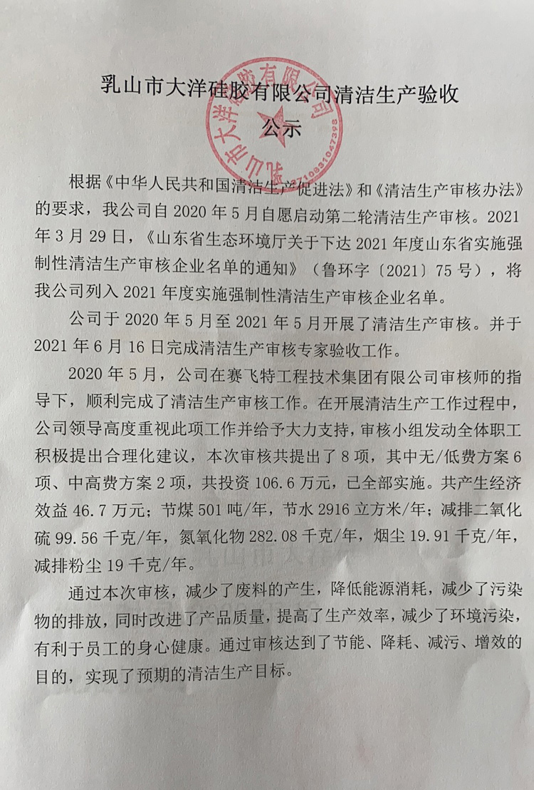 乳山市大洋硅膠有限公司 清潔生產(chǎn)驗(yàn)收公示